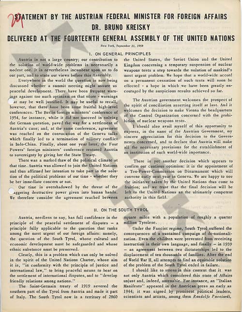 Rede von Außenminister Bruno Kreisky über Südtirol vor der Generalversammlung der Vereinten Nationen am 21. September 1959.